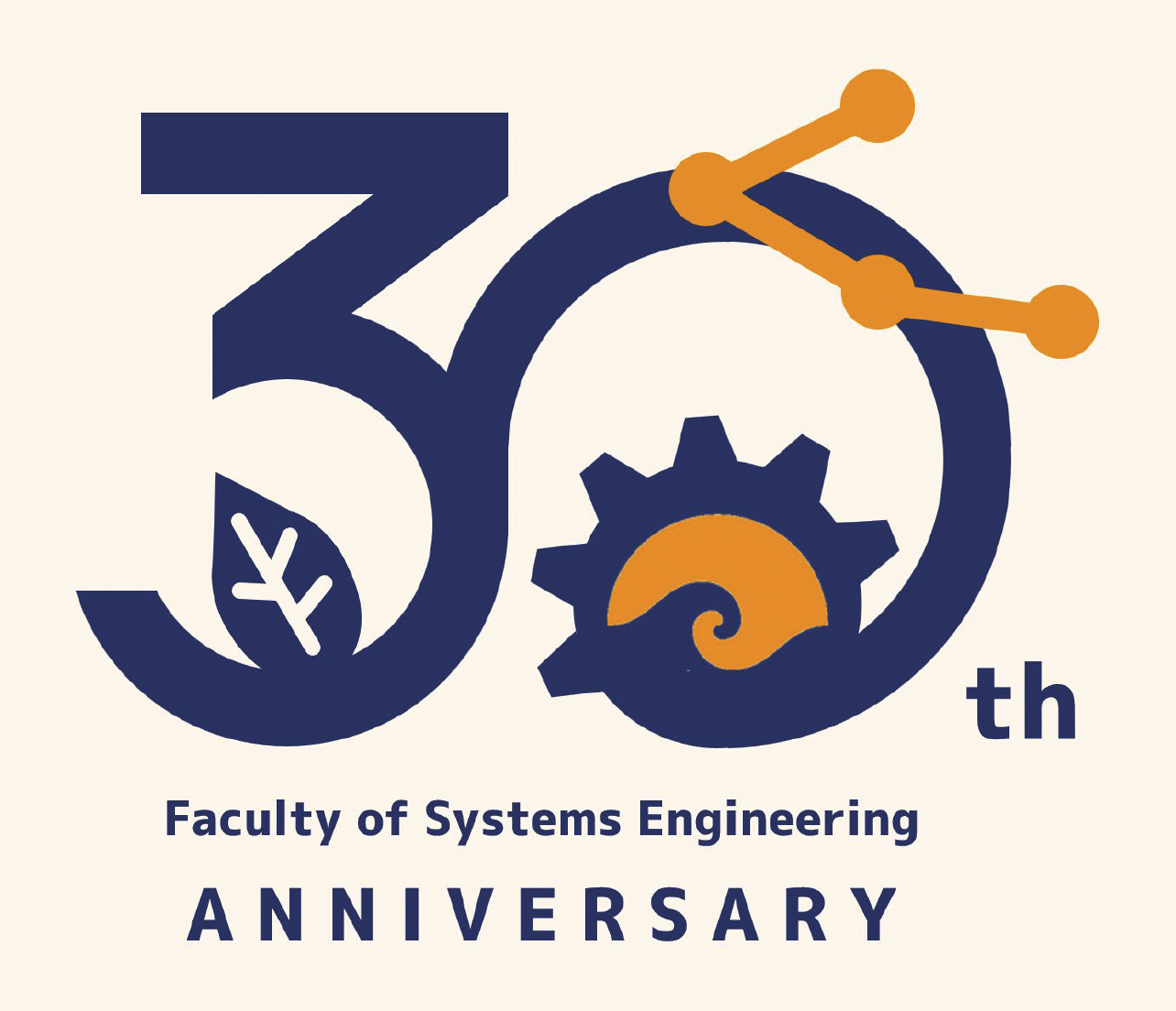 システム工学部は「応用理工学領域」「環境デザイン領域」「情報学領域」の3つの領域で構成され、それぞれを歯車・葉・グラフのアイコンで表現しています。歯車は応用理工学、葉は環境デザイン、そしてデータのつながりを示すオレンジの線と点は情報学を象徴しています。中央には和歌山大学のマークも組み込み、30周年の節目を記念するロゴに仕上げました。