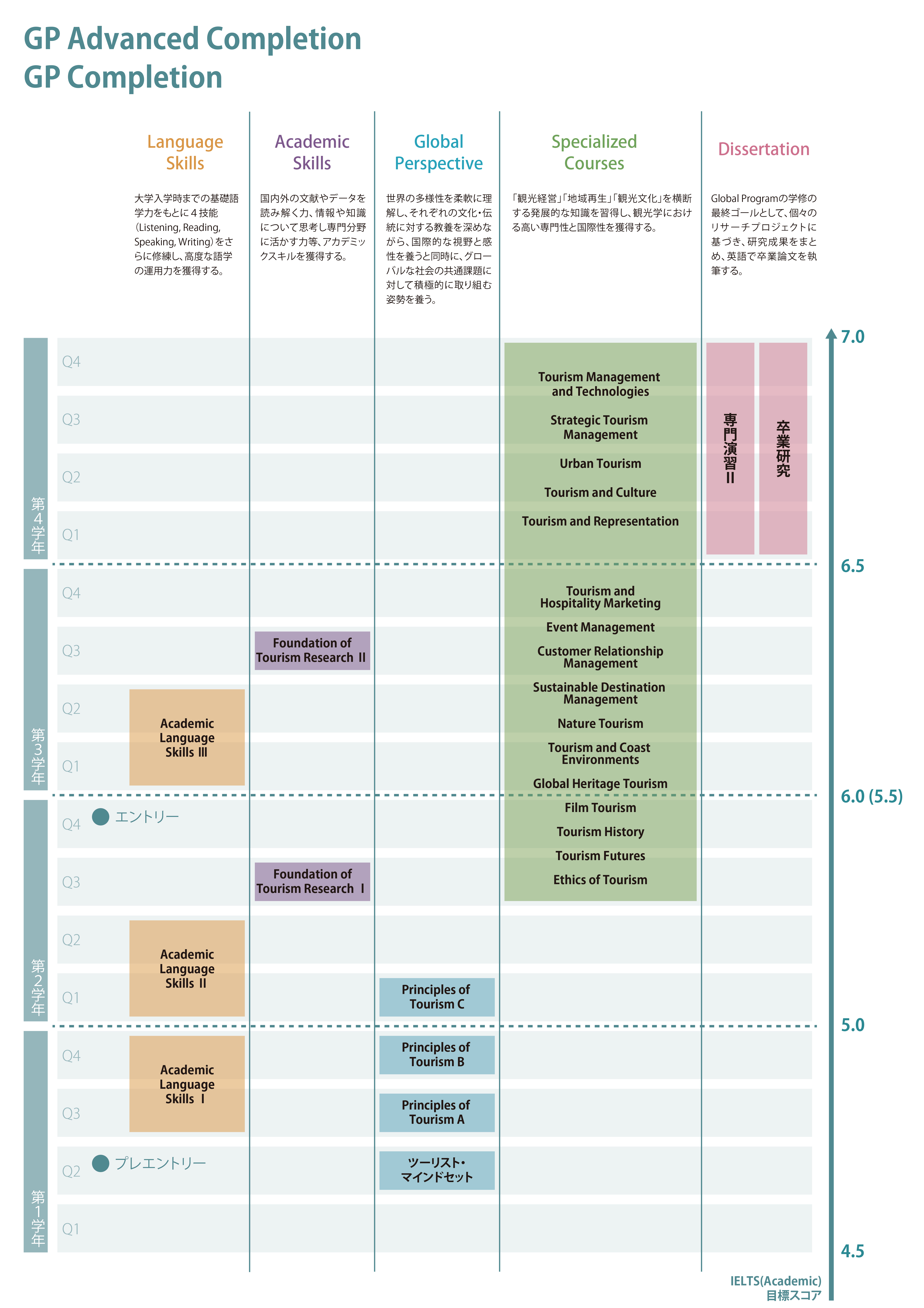GP指定科目を履修して英語で卒業論文(Dissertation)を書くことを目指します。Language Skills、Academic Skills、Global Perspectiveの3要素を通じて基礎を身に付けたうえで、Specialized Courses/GP専門科目の履修により国際的に展開される観光学の専門知識を修得し、学びを発展させて、自らの考えを発信できる力を身につけます。
