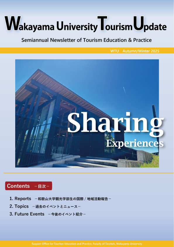 Newsletter -Wakayama University Tourism Update ツイート 「WTU(Wakayama University Tourism Update)」は、 観光実践教育サポートオフィスが編集・発行しているNewsletter(年2回発行)です。 最新号 2025AW (2025年10月発行) バックナンバー 2025SS (2025年4月発行) 2024AW (2024年10月発行) 2024SS (2024年4月発行) 2023AW (2023年10月発行) 2023SS (2023年4月発行) 2022AW (2022年10月発行) 2022SS (2022年4月発行) 2021AW (2021年11月発行) 2021SS (2021年4月発行) 2020AW (2020年11月発行) 2020SS (2020年4月発行) 2019AW (2019年11月発行) 2019SS (2019年4月発行) 2018AW (2018年11月発行) 2018SS (2018年4月発行) 2017AW (2017年11月発行) 2017SS (2017年4月発行) 2016AW (2016年11月発行) 2016SS (2016年6月発行) No.11 (2015年10月発行) No.10 (2015年4月発行) No.9 (2015年1月発行) No.8 (2014年11月発行) No.7 (2014年10月発行) No.6 (2014年6月発行) No.5 (2014年2月発行) No.4 (2013年12月発行) No.3 (2013年10月発行) No.2 (2013年7月発行) No.1 (2013年5月発行)