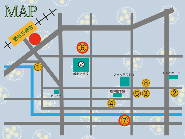 ①~⑧:各カフェイベント開催場所 / 赤丸:観望会開催場所