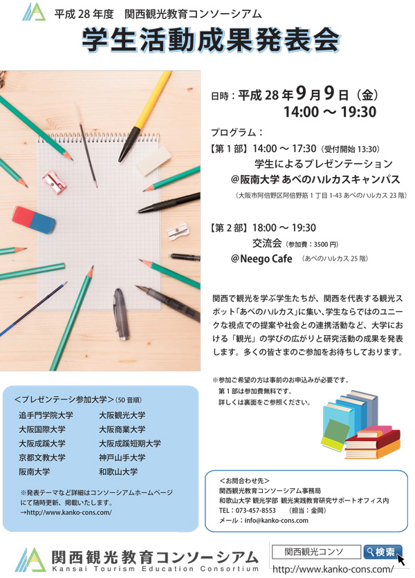 関西観光教育コンソーシアムが主催する「学生活動成果発表会」に和歌山大学も出展いたします。
