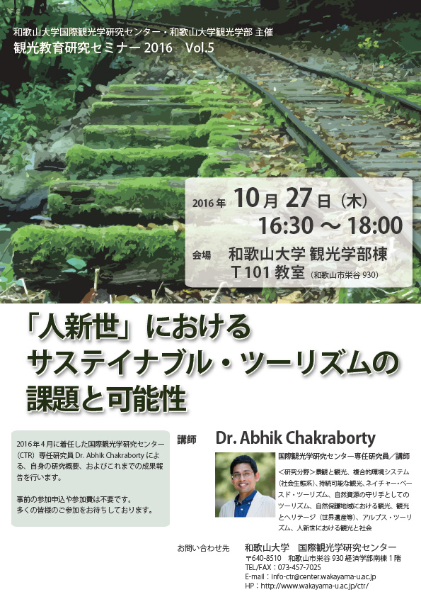 2016年4月に着任した和歌山大学国際観光学研究センター(CTR)専任研究員Dr. Abhik Chakraborty による、自身の研究概要、およびこれまでの成果報告を行います。