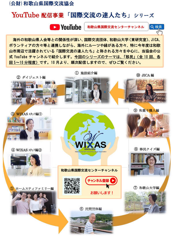 公益財団法人 和歌山県国際交流協会が、海外の和歌山県人会等との関係が深い国際交流団体、和歌山大学、JICA、ボランティアの方々等と連携し、海外にルーツや縁がある方々、特に2021年度は和歌山市周辺で活躍している「国際交流の達人たち」と称される方々を紹介する動画を、和歌山県国際交流センター公式YouTubeチャンネルで配信しています。