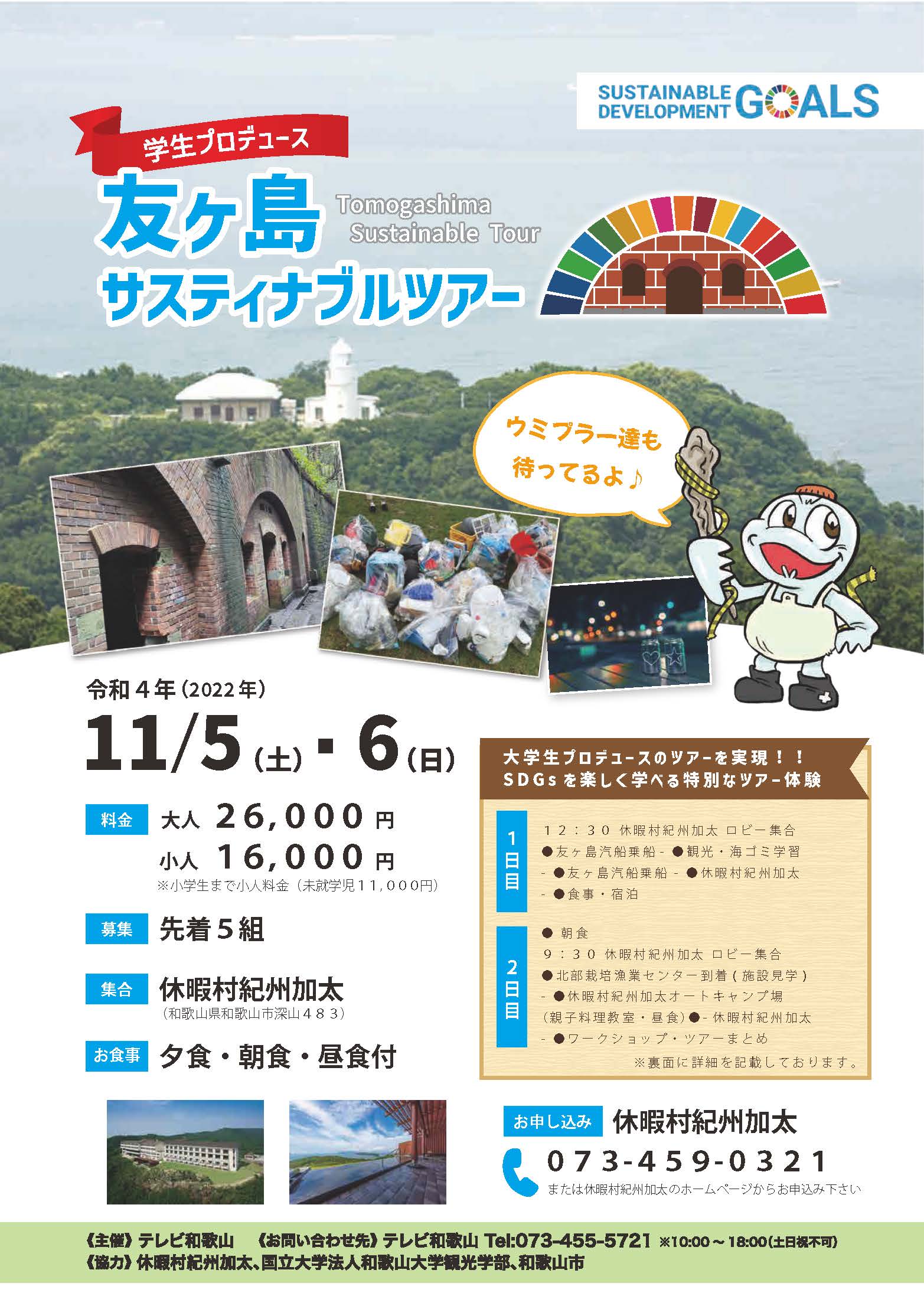今年7月の「友が島サスティナブルツアー企画(主催:株式会社テレビ和歌山)」でグランプリを受賞した本学部生の企画が、この度、休暇村紀州加太の宿泊プラン(先着5組限定)として実施されます。