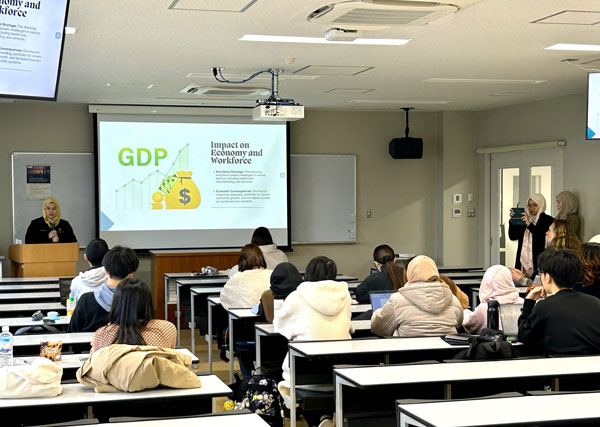 講師からは、マレーシアやムスリムの文化について、また、ムスリムフレンドリーツーリズムを学び、日本でいかに活用していくか等を紹介いただきました。Global Programで学ぶ観光学部生を中心とした約30名の参加者からも、大学でムスリムフレンドリーや多様性をどのように進めていけるか、学内に留めず地域に広げていければムスリムの観光客を増やしていけるのではないか等、活発な意見が出されました。