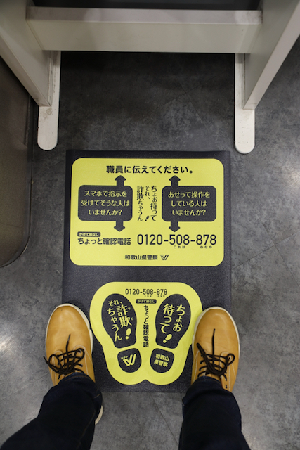 相次ぐ特殊詐欺に対する啓発と注意喚起を行い、被害を未然に防ぐ目的で金融機関のATM前に設置されます。縦60cm、横42cmのフロアマットで、コロナ禍で習慣付いた足形に並ぶと自然と目に触れるように工夫しています。また、自分にも関係のある情報だと受け取ってもらいやすくするために、和歌山弁で「ちょぉ待って!」「それ、詐欺ちゃうん!」と呼びかけています。さらには、当事者だけでなく、周囲の人にも気付いてもらって、専用ダイヤルや職員への連絡など次の行動につながるようにしています。このマットは、県内の金融機関180店舗に約700枚配布されます。