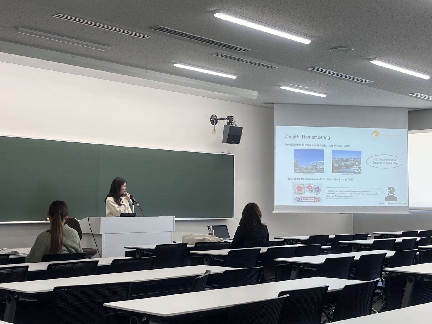 本年度は、学会のさらなる国際化を目指し、日本語・英語のバイリンガル方式で学会の運営がなされ、英語でのセッションが設けられました。本学からは、観光学部4年生の花井佑果さん(Doeringゼミ)と望月なぎささん(永井ゼミ)、永井隼人観光学部准教授、観光実践教育サポートオフィス山岸大二郎特任助教、和歌山大学国際観光学研究センターHusna Zainal Abdin特任講師の5名が英語セッションで発表しました。
