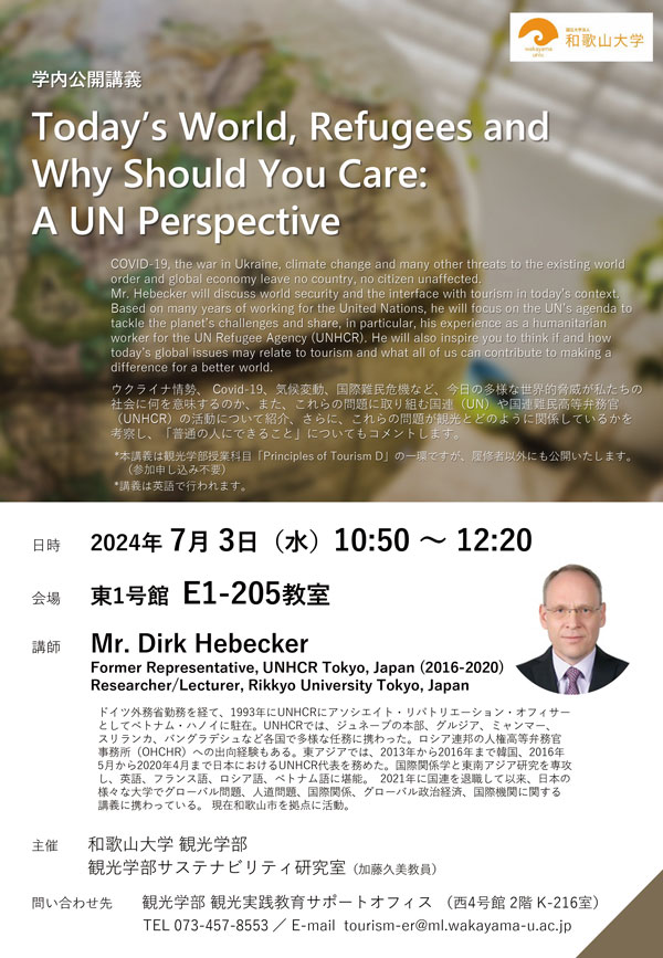2016年5月から2020年4月まで日本におけるUNHCR代表を務めたMr. Dirk Hebeckerを講師にお招きし、ウクライナ情勢、Covid-19、気候変動、国際難民危機など、今日の多様な世界的脅威が私たちの社会に何を意味するのか、また、これらの問題に取り組む国連(UN)や国連難民高等弁務官(UNHCR)の活動についての紹介や、これらの問題が観光とどのように関係しているかを考察し「普通の人にできること」について考えます。