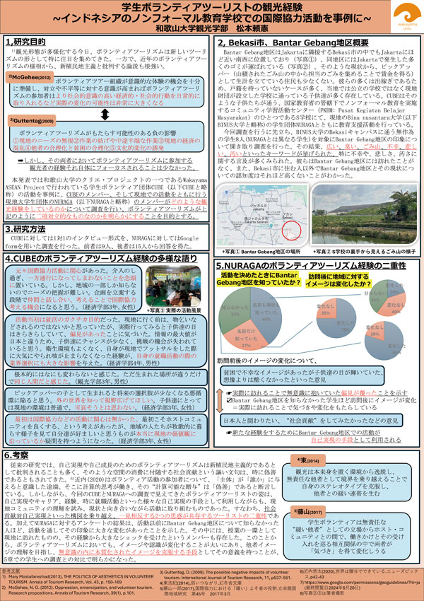 発表要旨:ボランティアツーリズムは他者理解のためのツーリズムとしてもてはやされる一方、新植民地主義と批判する論説も根強い。しかしながら、ボランティアツーリズムに参加する観光者の経験それ自体がフォーカスされることは少なかった。当発表ではインドネシアのノンフォーマル教育学校での教育支援活動を通じた学生ボランティアの観光経験に着目した調査を行った。調査の結果、ボランティアツーリズムは自己実現や自己成長のために利用されている側面がある一方、活動を通じて現地の状況を知り、他者理解を試みる姿勢があることがわかった。