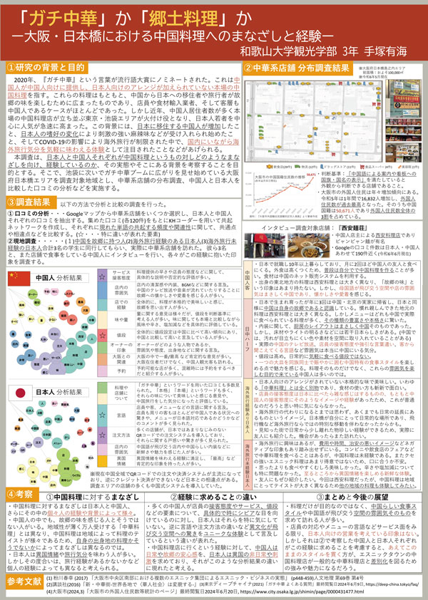 発表要旨:近年日本で話題の「ガチ中華」とは、中国人が中国人向けに提供し、日本人向けのアレンジが加えられていない料理を指す。ガチ中華激戦区として池袋が知られているが、大阪でもガチ中華の店が広がりを見せている。本調査では、これからさらなる変貌や規模の拡大が期待される大阪市日本橋島之内に注目し、このエリアにおける中華系店舗の分布調査、中国人と日本人を比較した口コミの分析などを実施する。そして、中国人と日本人を始めとする様々な人々が中国料理に対しそれぞれどのようなまなざしを向け、経験しているかを考察したい。