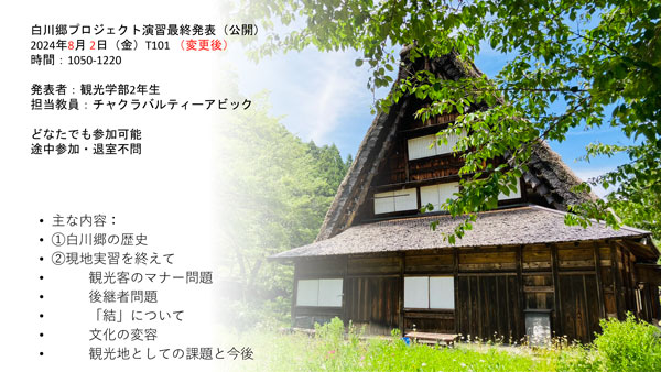 2024年度「プロジェクト演習(担当教員:Chakraborty Abhik)」受講生16名(観光学部2年生)による、岐阜県白川郷でのフィールドワーク発表会を下記の通り開催いたします。