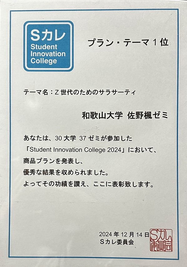 受賞しました!~Sカレ(Student Innovation College)2024:「Z 世代のためのサラサーティ」プラン・テーマ1位&商品化決定!(佐野楓ゼミ)