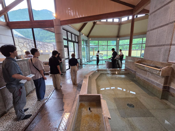 佐々木啓教員の担当した観光コースでは、10月にリニューアルオープンする道の駅遠山郷のプレオープンを見学させていただき、道の駅遠山郷を管理する株式会社遠山GOの経営者やスタッフの方々から貴重なお話をお伺いし、また温泉施設も含めた道の駅内各所を見学させていただきました。さらに、遠山郷観光協会の大蔵会長からも廃校利用施設である旧木沢小学校にて遠山郷そして飯田・南アルプスの山岳観光について貴重なお話をお伺いすることができました。