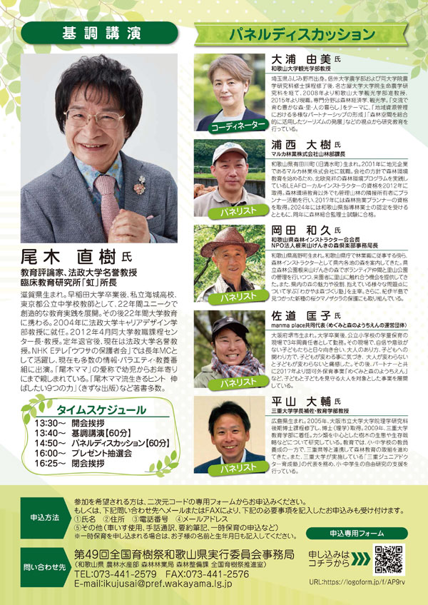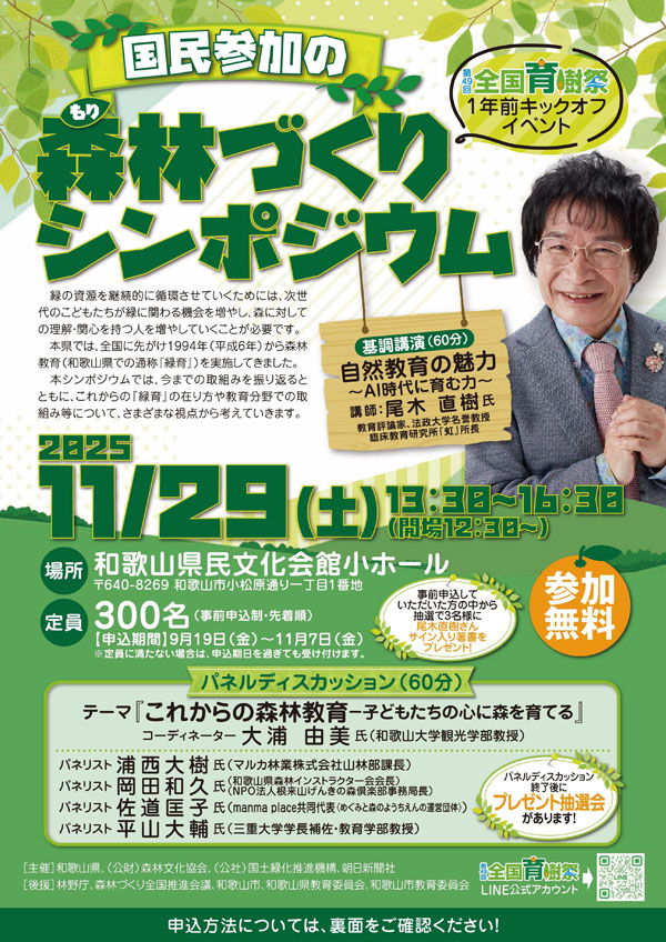 和歌山県などが主催する第49回全国育樹祭1年前キックオフイベント「国民参加の森林(もり)づくりシンポジウム」 に、パネルディスカッション『これからの森林教育―子どもたちの心に森を育てる―』のコーディネーターとして本学部の大浦由美教授が登壇します。