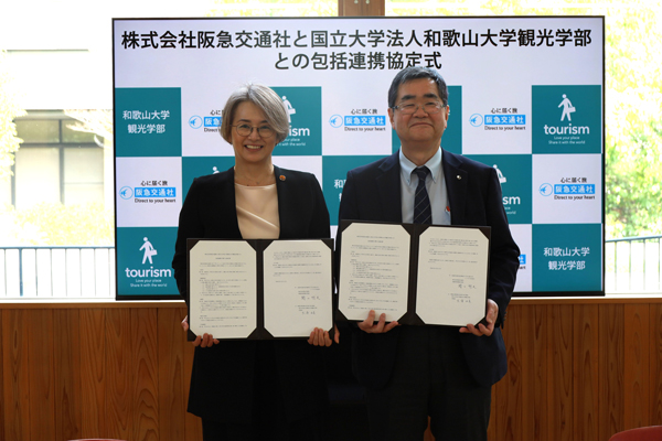 ツイート シェア 阪急交通社との産学連携に関する包括連携協定締結 公開日 2026年03月24日 2026年3月23日(月)、株式会社社阪急交通社と和歌山大学観光学部は本協定の調印式を行いました。 観光人材育成および、教育・研究の推進を目的とした本協定に基づき、観光業界における人材育成を通じて地域社会の持続可能な発展に寄与することを目指してまいります。 関連HP 和歌山大学観光学部と阪急交通社が包括連携協定を締結しました(2026年3月23日、和歌山大学HPページ) 戻る